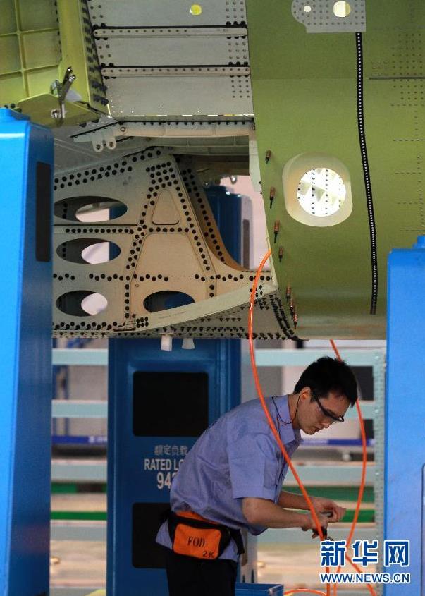 9月19日,技术人员在C919机体对合装配线上工作。当日,C919国产大型客机首架机在中国商飞公司新落成的总装制造中心正式开始机体对接,这标志着C919大型客机研制项目全面进入结构总装攻坚阶段。项目力争年底完成首架机机体结构对接,2015年底实现首飞。新华社记者裴鑫 摄