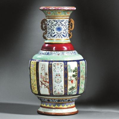 吕成龙就瓷母的价值向记者做了细致的分析。“自乾隆之后,再无烧造这类瓷器,因为它烧制工艺极为复杂。青花与仿官釉、仿汝釉、仿哥釉、窑变釉、粉青釉、祭蓝釉等均属于高温釉彩,需先高温焙烧。而洋彩、金彩及松石绿釉等均属于低温釉彩,应后入低温炭炉焙烧。这件各种釉彩大瓶集10多种高低温釉、彩于一身,而且各种釉、彩均发色纯正,如此复杂的工艺只有在全面掌握各种釉彩化学性能的情况下才能顺利完成”。