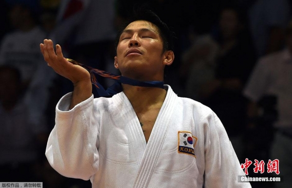 当地时间9月21日,第17届仁川亚运会柔道颁奖礼,韩国选手金宰范获得金牌。