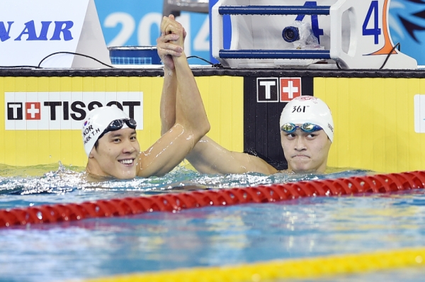 9月23日,孙杨(右)与韩国选手朴泰桓在比赛后。