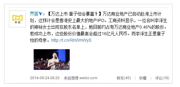 关键词:万达商业地产 万达商业地产上市 香港 章子怡 非常完美 章子怡妈妈 李涿生