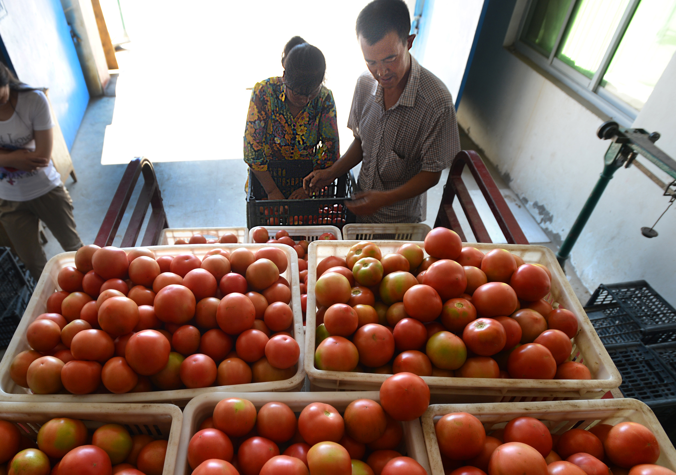 老伊在蔬菜产销专业合作社将自家产的新鲜西红柿进行装箱。