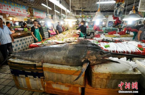 据了解,24日午夜,青岛市黄岛区积米崖渔港出海捕鱼的渔民在黄海海面捕获了这条巨型“箭鱼王”,并于今早被销售野生鱼的石姓老板收购下来。