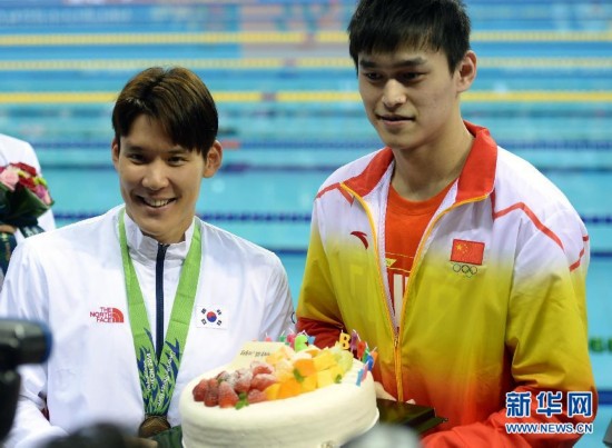 9月26日,在仁川文鹤朴泰桓游泳馆,中国选手孙杨(右)与韩国选手朴泰桓手捧生日蛋糕合影。当日,在2014仁川亚运会游泳项目全部结束后,中国选手孙杨送蛋糕给将于27日度过25岁生日的韩国选手朴泰桓。 新华社记者韩瑜庆摄