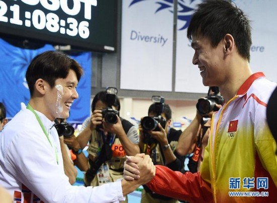9月26日,在仁川文鹤朴泰桓游泳馆,中国选手孙杨(右)向韩国选手朴泰桓送完蛋糕后握手。当日,在2014仁川亚运会游泳项目全部结束后,孙杨送蛋糕给将于27日度过25岁生日的韩国选手朴泰桓。 新华社记者王鹏摄