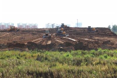 大片地块被渣土覆盖,上面推土机正在作业。京华时报记者谭青摄