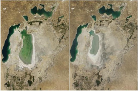 由于气候变化,附近山顶的积雪线上移,河流入水量急剧降低,使得咸海水面下降,达到了历史新低值。图中为2006年与2008年咸海面积对比图。