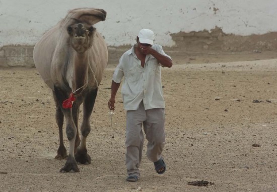 图中为当地居民牵着骆驼为躲避沙尘暴,向房屋跑去。