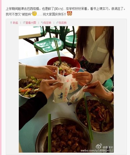近日,有网友爆料称奶茶妹妹与刘强东将于2014年11月18日这天在“上帝之城”里约热内卢举行婚礼。对此,奶茶妹妹章泽天1日在微博否认将结婚的消息:“上学期间翘课去巴西结婚,也是醉了。”早先,据接近刘强东的京东高层人士透露,刘强东与奶茶妹妹将结婚传闻不属实,是假新闻。奶茶妹妹还在微博中笑称:“在学校好好呆着,看书上课实习,很满足了。我可不想又“被挂科”……祝大家国庆快乐!”