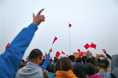 国旗升至旗杆顶部,迎风飘扬。广场上的人们向着国旗挥手。(记者 浦峰摄)
