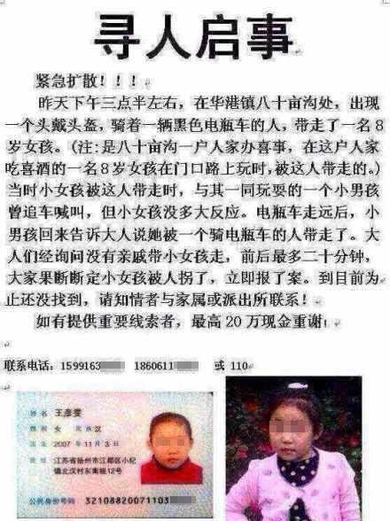 当晚,远在西安打工的父母亲,得知女儿失踪的消息,连夜赶往扬州老家。他们找了几天,毫无进展,于是托朋友在网上发布寻人启事,“如有提供重要线索者,最高20万现金重谢”。