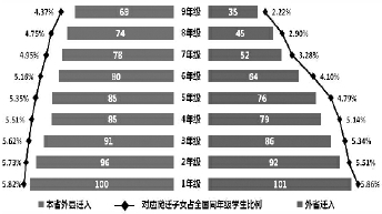 从2012年中国进城务工人员随迁子女年级结构可见,随着年级的升高在校就读的进城务工人员随迁子女人数逐渐下降。考虑到中国流动人口数量一直在持续增长,一种可能的原因是进城务工人员随迁子女入学人数一直在持续增长,另一种可能的原因则源于进城务工人员随迁子女在城市升学依然会面临诸多困难,随着年级的升高部分随迁子女被迫返乡,从而导致高年级人数的下降。实际情况可能是两个原因兼而有之。