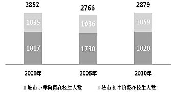 城市义务教育阶段在校生人数2000年为2852万,2005年小幅下降至2766万,至2010年变化为2879万,10年间城市义务教育阶段在校生人数变化很小,学位供给仅仅增加了47万,占学位总数的1.6%。