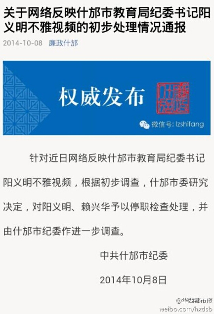 上午11时许,新京报记者从什邡市纪委获悉,针对近日网络反映什邡市教育局纪委书记阳义明不雅视频,根据初步调查,什邡市委研究决定,对阳义明、赖兴华予以停职检查处理,并由什邡市纪委作进一步调查。