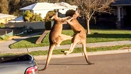 近日,一段澳大利亚袋鼠当街斗殴的视频在网络上迅速走红。这段长达5分钟的视频,拍摄于澳大利亚新南威尔士州郊区的一条街道上,两只身形庞大的袋鼠进行了一场如史诗般激烈的决斗。