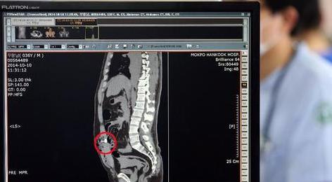 这是韩国医院方面10月10日公布的死亡的中国船长的CT扫描图,图像显示其左侧腹部有中弹的枪伤,体内还留有子弹残骸。 新华社/韩联社