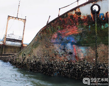 据外媒报道,西班牙籍街头艺术家Pejac近日在泊靠在西班牙北部港市桑坦德港口内的一艘废弃货轮船头处完成了对莫奈名篇《日出·印象》的“完美再现”。据悉,为完成相关艺术创作,艺术家Pejac不得不借助一艘小型游艇做支撑。如今创作已大功告成,还真的与原作莫奈之《日出·印象》几分神似。