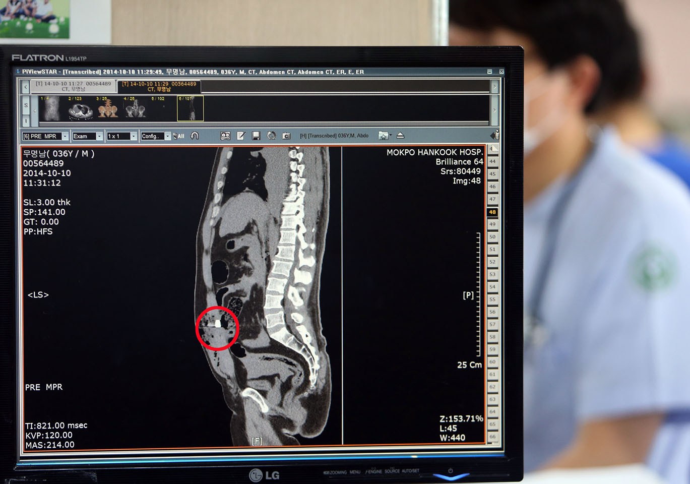 当地时间2014年10月10日,韩国木浦,医生展示通过拍片在中国船员身上发现的子弹。