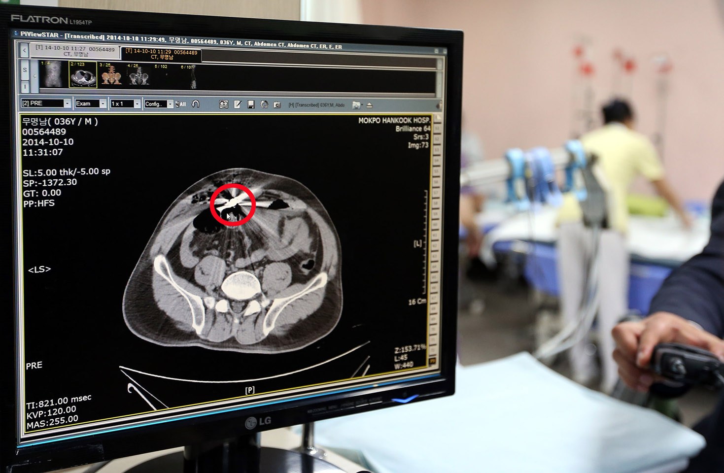 当地时间2014年10月10日,韩国木浦,医生展示通过拍片在中国船员身上发现的子弹。