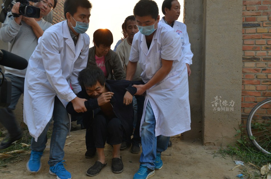 图为车卫众在医护人员的协助下走出门口,接受治疗。齐鲁网记者 于鹏 摄
