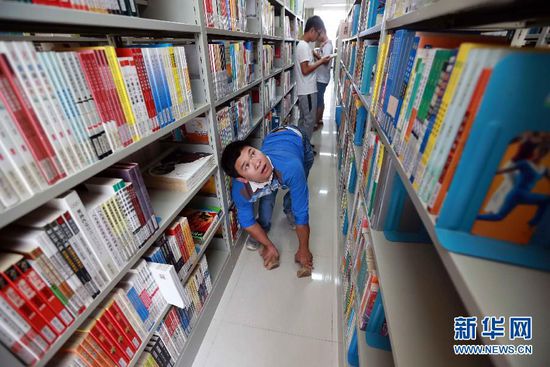 新华社照片,桂林(广西),2014年10月10日 爬着上大学 10月9日,小乐在图书馆找书。