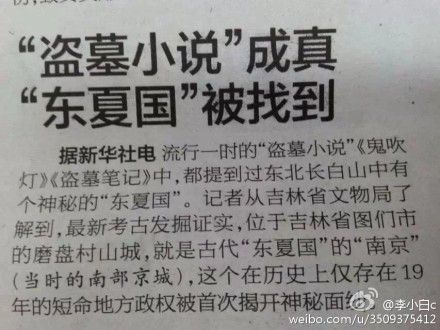 流行一时的“盗墓小说”《鬼吹灯》、《盗墓笔记》中,都提到过东北长白山中有个神秘的“东夏国”。而近日,吉林省文物局真的在吉林省图们市的磨盘村山城发现了这个神秘的“东夏国”的遗址。10月11日晚,有网友晒出报纸报道此新闻的截图,并感叹道:“@南派三叔 三叔,我妈妈问我为啥要跪着玩手机。”引来上万网友的热议。