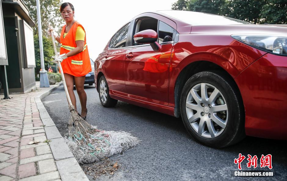图为10月11日,47岁的康明秀在自己的车旁边清扫责任路段。在问起为何还要做这份工作时,她回答,当初新区建设还不成型时,灰尘比较多,天天灰头土脸,如今路面更加干净,没理由不再坚持下去,或许会一直干到退休。中新社发 张浩 摄