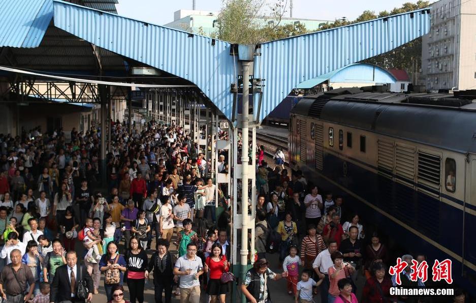 从10月14日凌晨起,拥有78年历史的南京中华门火车站将停止办理客运业务,连日来市民蜂拥而至,用乘坐客车的方式告别这座老牌火车站。南京中华门火车站于1935年4月随江南铁路的建成而同步投入使用,是中国著名的近现代铁路历史建筑。图为10月11日,上千市民在中华门火车站检票进站,乘坐火车告别这里。中新社发 泱波 摄