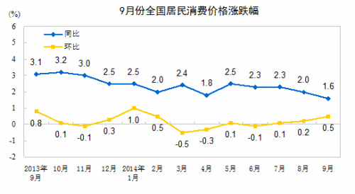 中新网10月15日电 据国家统计局网站消息,国家统计局公布的数据显示, 2014年9月份,全国居民消费价格总水平同比上涨1.6%。其中,城市上涨1.7%,农村上涨1.4%;食品价格上涨2.3%,非食品价格上涨1.3%;消费品价格上涨1.4%,服务价格上涨2.3%。1-9月平均,全国居民消费价格总水平比去年同期上涨2.1%。
