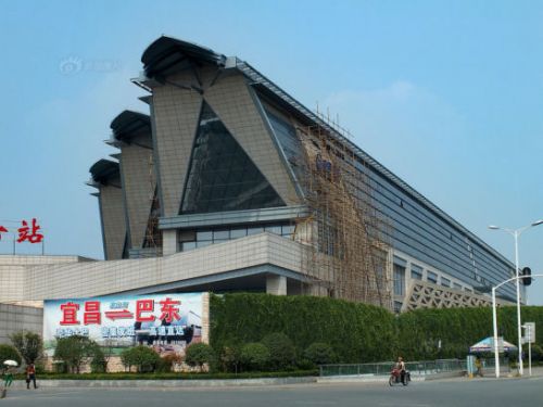 2014年8月3日,湖北宜昌市,地标性建筑物宜昌汽车客运中心站酷似棺材造型的外墙搭起脚手架进行维修。这座貌似“棺材”的建筑运行近两年多来,无时不引起过往旅客和司机的吐槽。相关负责人称,客运站正面设计为一艘扬帆起航的帆船,侧面的造型酷似棺材,纯属巧合。