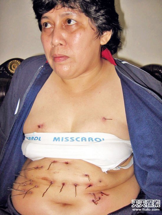 2008年8月,时年40岁的印尼女子诺斯延德赫罹患一种举世罕见的怪?。?7年来,她的腹部和胸部源源不断地“长出”一根根金属丝,而它们在被剪断之后,不久又会从其他地方“破土而出”。