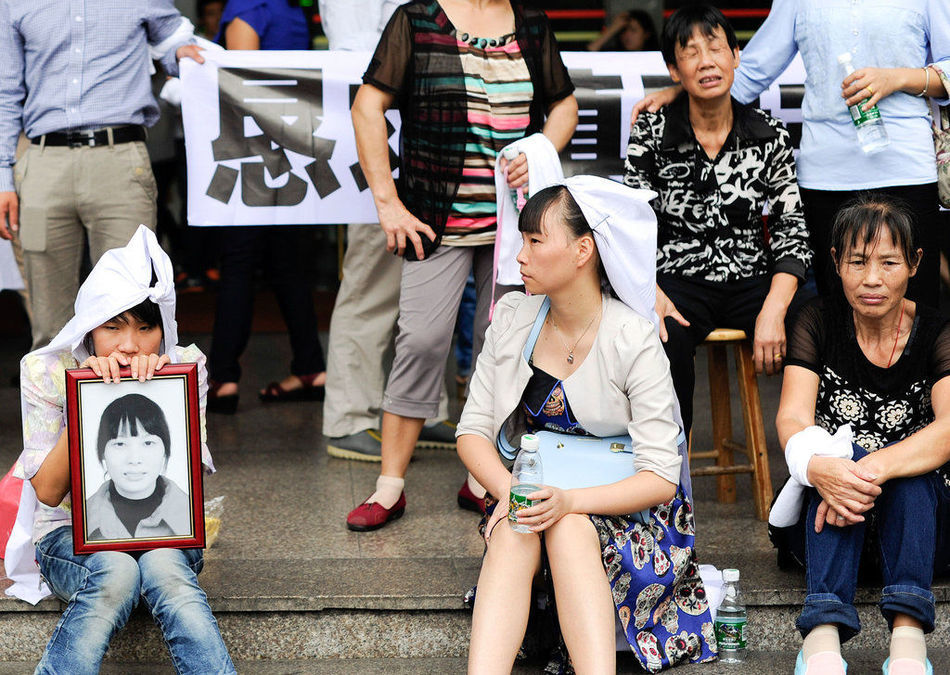 图为家属在医院门口请求医院赔偿。