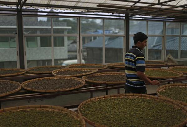 老班章村的吐二正在自家茶棚晒茶。 澎湃新闻记者 程艺辉 图