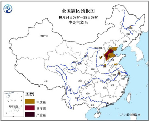 中新网10月24日电 据中央气象台消息,中央气象台10月24日6时继续发布霾黄色预警:预计24日8时至25日8时,北京南部、天津、河北中南部、山东西北部、河南中部、山西中部、江苏西南部等地的部分地区有中度霾,其中,北京东南部、天津西部、河北中部的局部地区有重度霾。另外,今天早晨至上午,上述部分地区有大雾,局部地区有能见度不足500米的浓雾。
