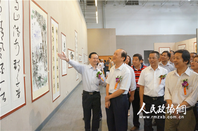 10月24日,在书画展上,翔安区政协副主席邵文化(左一)向厦门市政协副主席魏刚(左二)、翔安区政协主席林进胜(右二)等嘉宾介绍参展的优秀作品。记者 照宁 摄