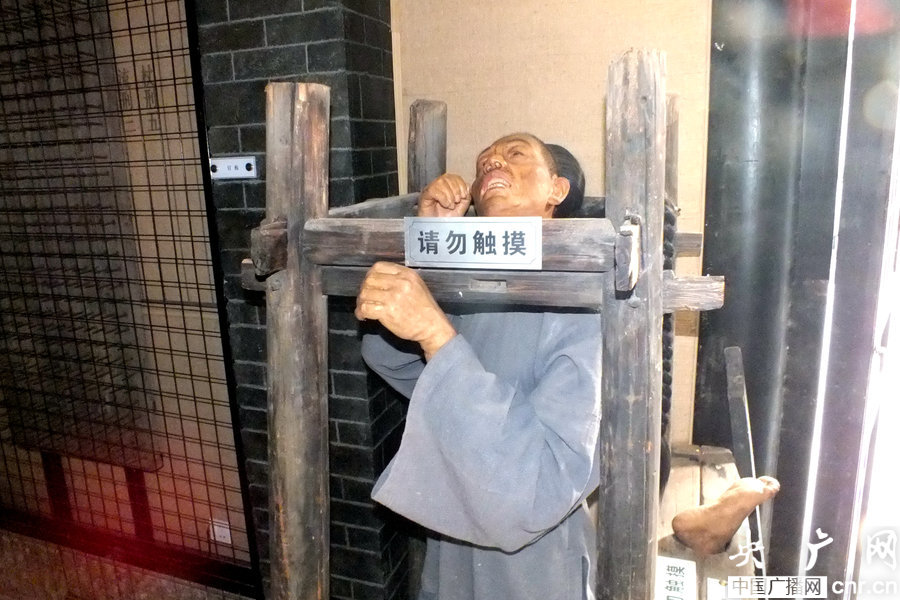 “站笼”,又称“立枷”,是明朝大太监刘瑾发明的一种刑具,笼上有一个口,卡往囚犯的颈部,让犯人日夜站立直到死去。这是“全身枷”,刑犯全身上下从头到脚都戴着枷锁。