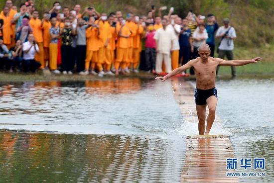 当日,泉州少林寺武僧释理亮在福建省泉州市区草邦水库表演了“水上漂”功夫。经过两次预热,他在媒体和观众的注视下,借助三合板用脚尖飞快地在水上成功“漂”出118米远,刷新了他自己100米的纪录。
