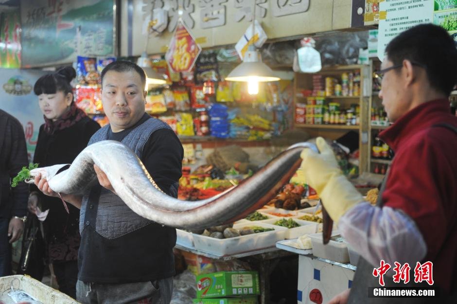 10月27日,一条长1.98米,重45斤的巨型海鳗鱼被摆放到山东省青岛市一家海产品摊档上销售,引起市民围观。据了解,今晨2点左右,胶州渔民在黄海海域捕获到这条巨型海鳗鱼。    中新社发 王海滨 摄    图片来源:CNSPHOTO