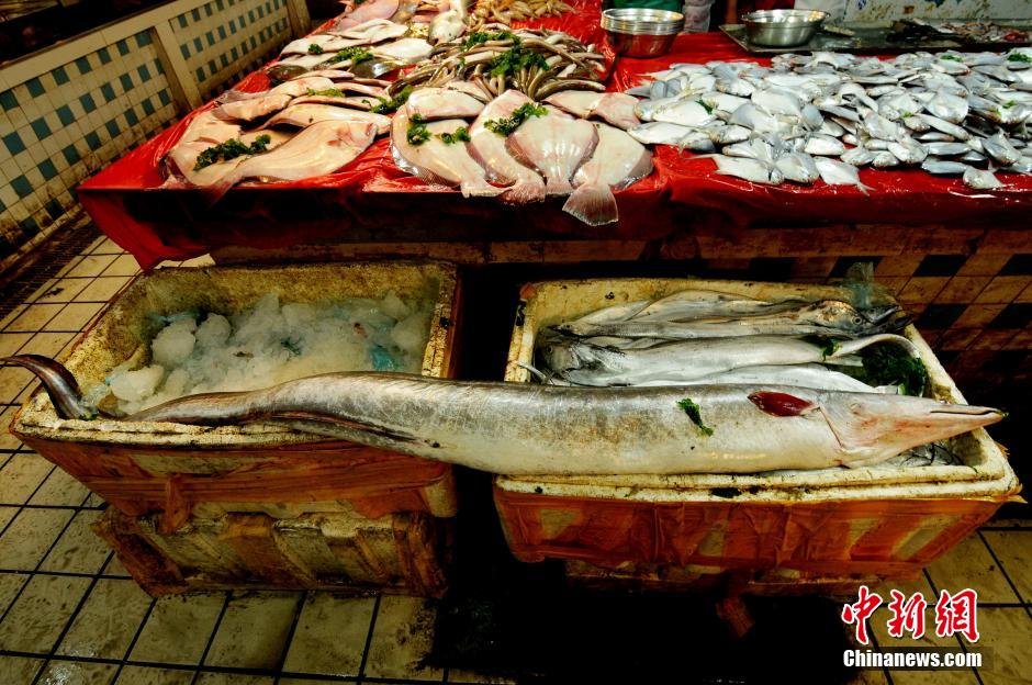 10月27日,一条长1.98米,重45斤的巨型海鳗鱼被摆放到山东省青岛市一家海产品摊档上销售,引起市民围观。据了解,今晨2点左右,胶州渔民在黄海海域捕获到这条巨型海鳗鱼。    中新社发 王海滨 摄    图片来源:CNSPHOTO
