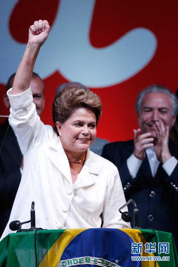 10月26日,巴西现任总统、劳工党候选人迪尔玛·罗塞夫在首都巴西利亚庆祝胜利。据巴西最高选举法院当地时间26日晚公布的对98%选票的统计结果,在巴西大选第二轮投票中,现任总统、劳工党候选人迪尔玛·罗塞夫获得51.48%的选票,连任巴西总统。新华社美联