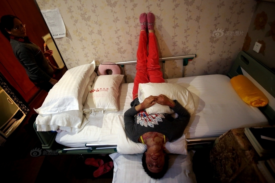 病床上的周岩正做拉撑练习,帮助恢复颈部和背部功能,防止皮肤和肌肉萎缩。这个复健过程极其痛苦,病房墙上的复健表格里写着“哪里最紧就活动哪里”。最紧的部分,一旦拉伸,也就最疼。有时周岩会产生抵触情绪,“我真的受不了了,太疼了!”
