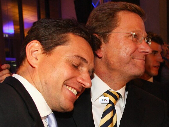 2009年9月27日,德国柏林,德国自由民主党主席基多·威斯特威勒(右)与“男友”迈克尔·穆隆兹一起庆祝。德国第17届联邦议院选举初步结果27日晚揭晓,自民党获得大约14.7%的选票,有望与联盟党组成执政联盟。
