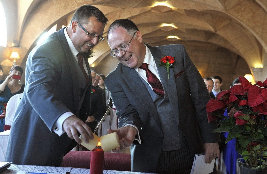 当地时间2012年12月19日,西班牙格拉纳达,澳大利亚政府社会事务部的部长伊恩·亨特(右)与自己的同性伴侣Leith Semmens举行婚礼。