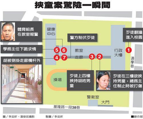 中新网10月31日电 据台湾《联合报》报道,30岁池姓男子昨天(30日)中午闯入台北市兴雅小学,挟持小学四年级的胡姓男童,让男童头下脚上倒挂四层楼高的走廊栏杆外,还咬伤男童大腿;学务主任刘昶让下跪求情,他才拉起男童席地而坐“熊抱”。警方获报赶到,强力扭开他双手救出男童,结束一场虚惊。