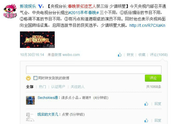 央视新闻官方微博还透露中央电视台台长胡占凡提出今年春晚保证三个不用,不用低俗媚俗节目;不用格调不高的节目;不用有污点和道德瑕疵的演员。胡占凡表示央视会坚持开门办春晚,面向全国通过网络征集,启用选拔节目的获奖选手,少请明星大腕。被网友点赞!另外,网友希望多点小品类节目。