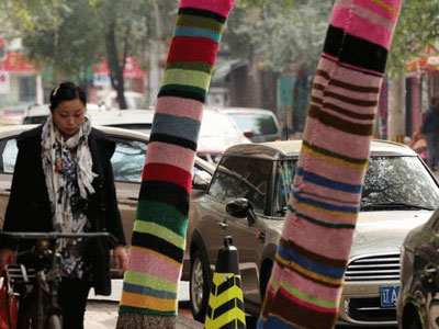 昨日 ,在沈阳市九纬路和平大街路口,3棵穿着“彩虹秋裤”的大树格外显眼,这“秋裤”来自旁边的一家发廊。北国网、辽沈晚报记者查金辉摄