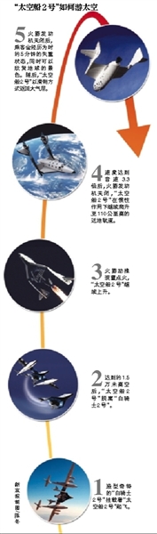 “太空船2号”由美国斯凯尔德复合技术公司制造,长18米,可容纳两名飞行员和最多6名旅客。太空船侧面和舱顶各有大窗户,便于旅客观赏太空。