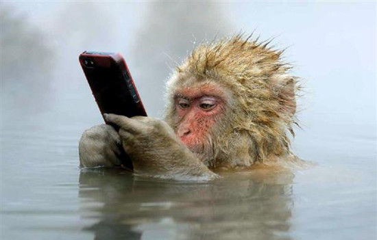不能更惬意:日本猴子边泡温泉边玩手机 表情专注(图)