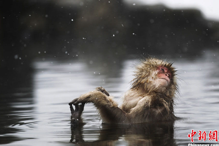 不能更惬意:日本猴子边泡温泉边玩手机 表情专注(图)