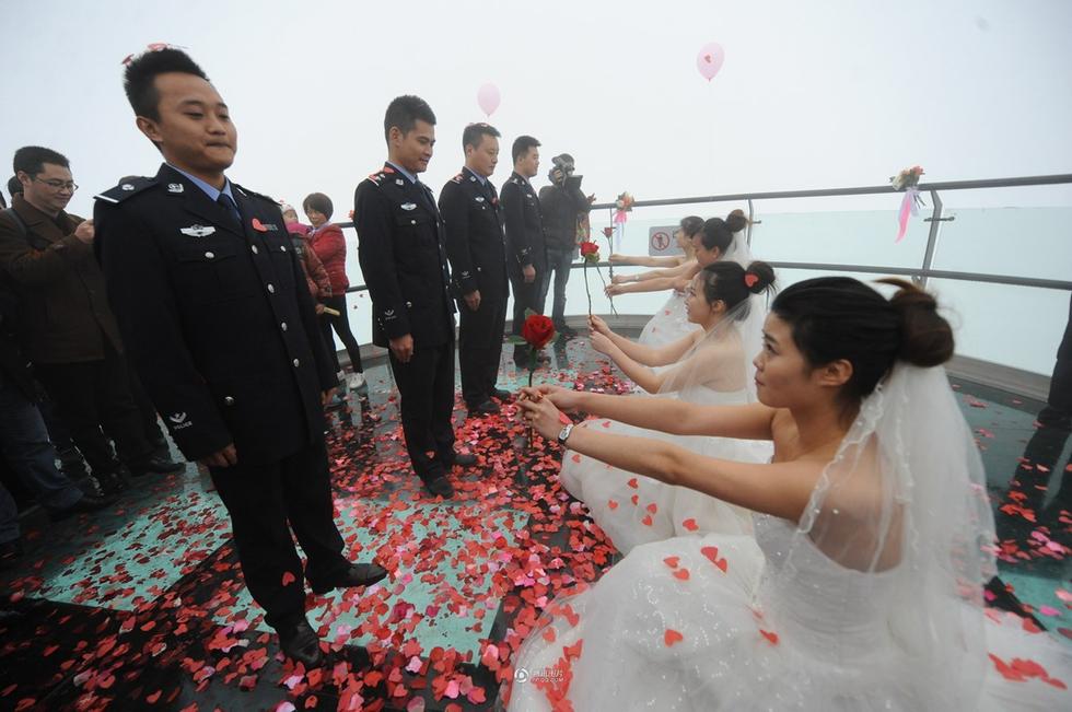 “让我嫁给你吧!”11月9日,双十一前夕,在四川省广元市剑阁县剑门关景区高空玻璃观景平台上, 4位美女手捧玫瑰,身穿婚纱单膝跪地,向各自的剑阁县民警男友求婚,在现场上百名游客见证了这一激动人心的凤求凰场面。摄影 马俊明